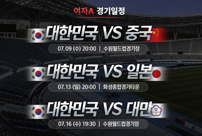 - 7์ 9์ผ(ํ) 20:00 ๏ฝ ๋ํ๋ฏผ๊ตญ vs ์ค๊ตญ (์์ ์๋์ปต๊ฒฝ๊ธฐ์ฅ)